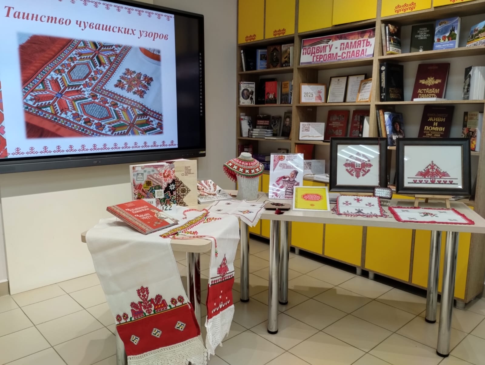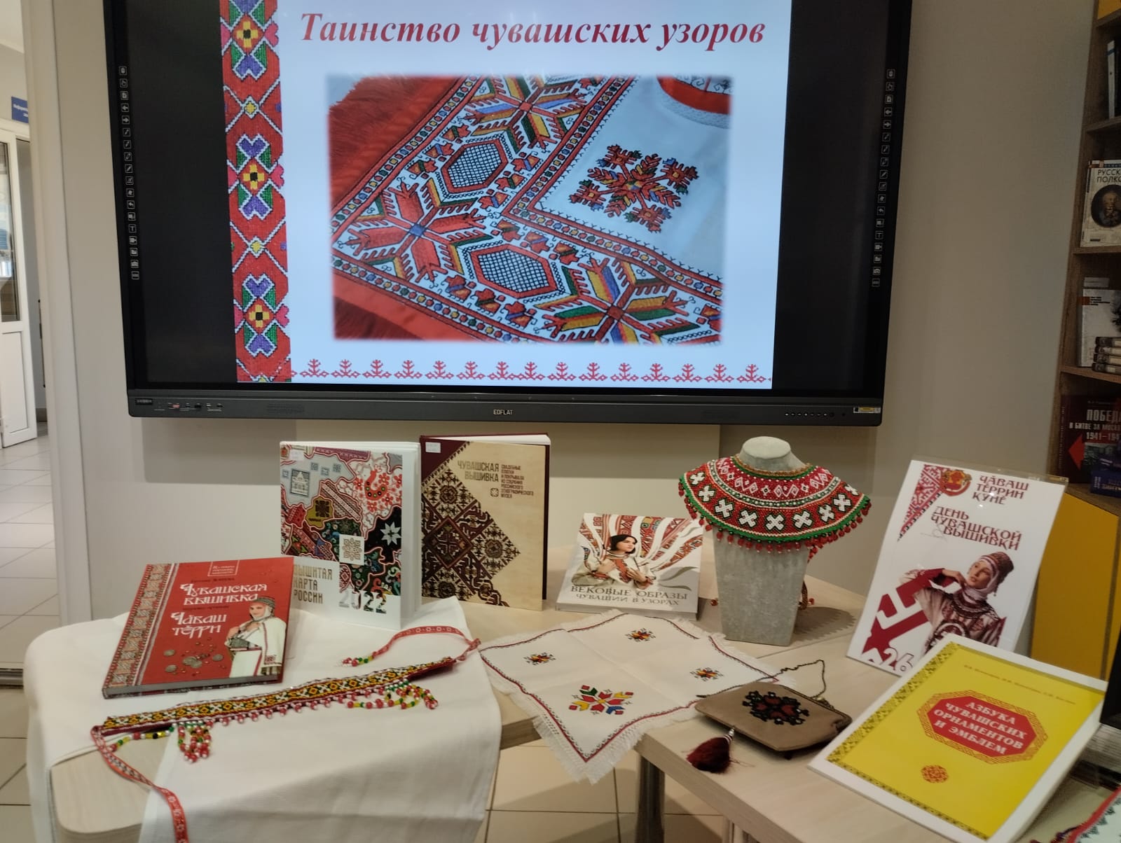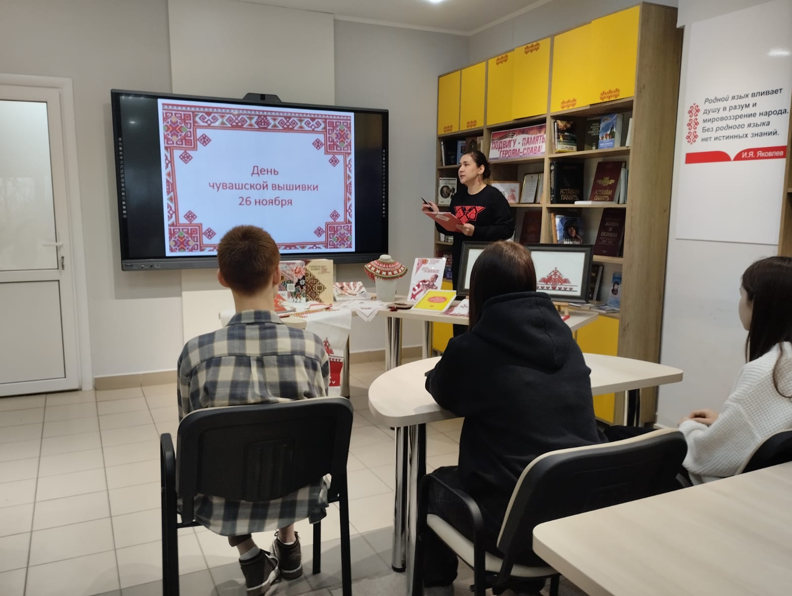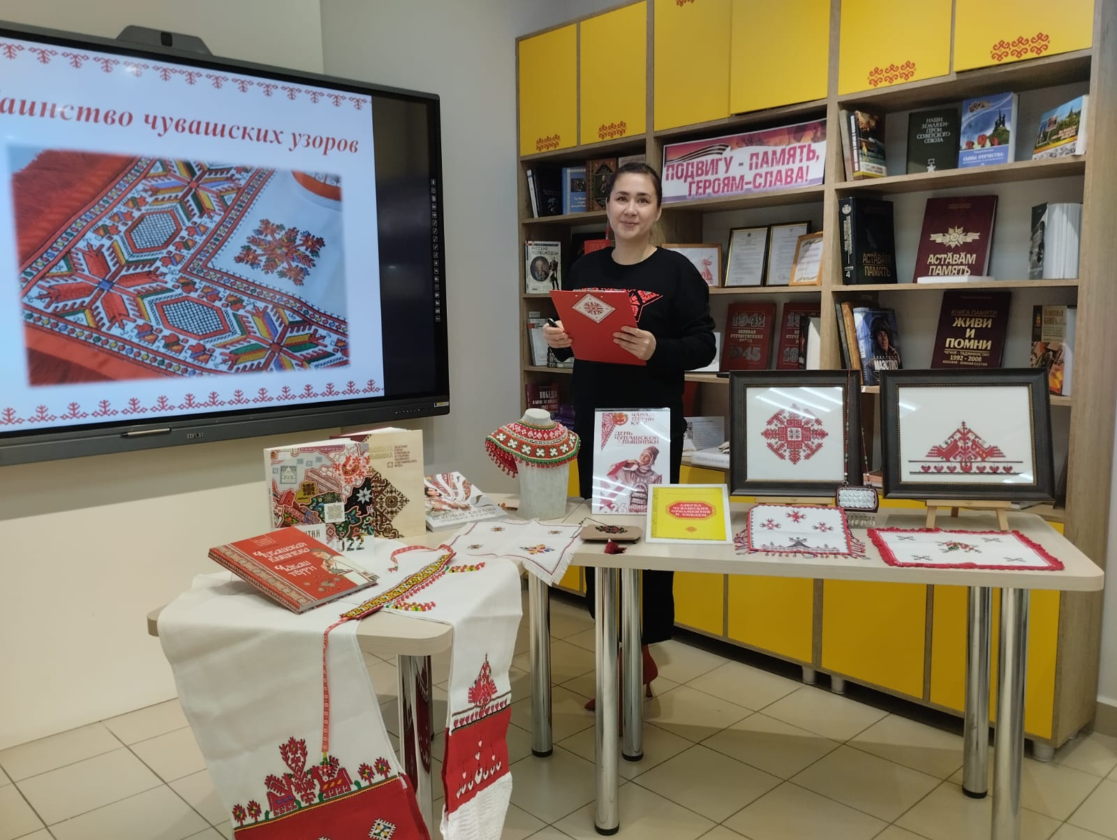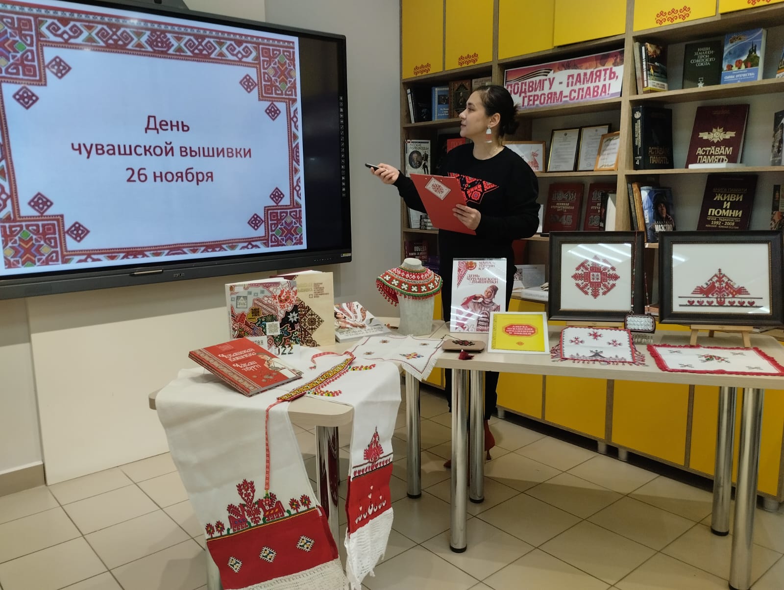 Мастерица продемонстрировала участникам мероприятия свои работы, показав современное прочтение традиционных чувашских орнаментов. В завершение встречи библиотекарь провела для присутствующих обзор книжной выставки «26 ноября — День чувашской вышивки», представив литературу, посвященную истории и технике национальной вышивки.