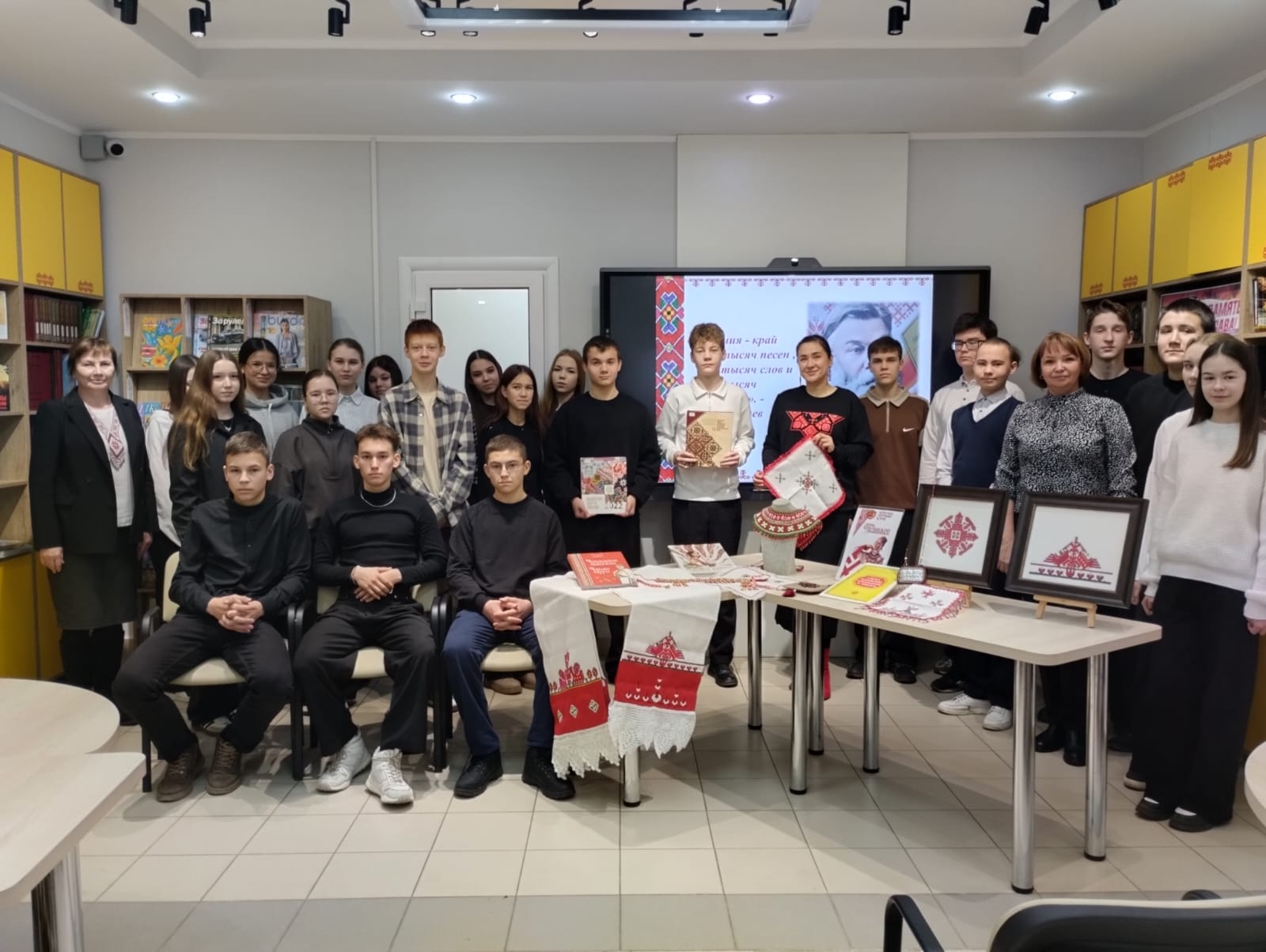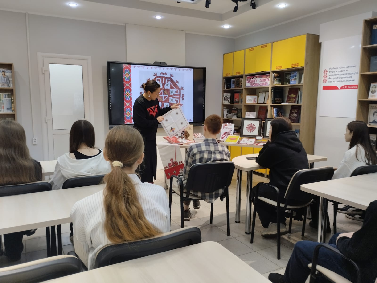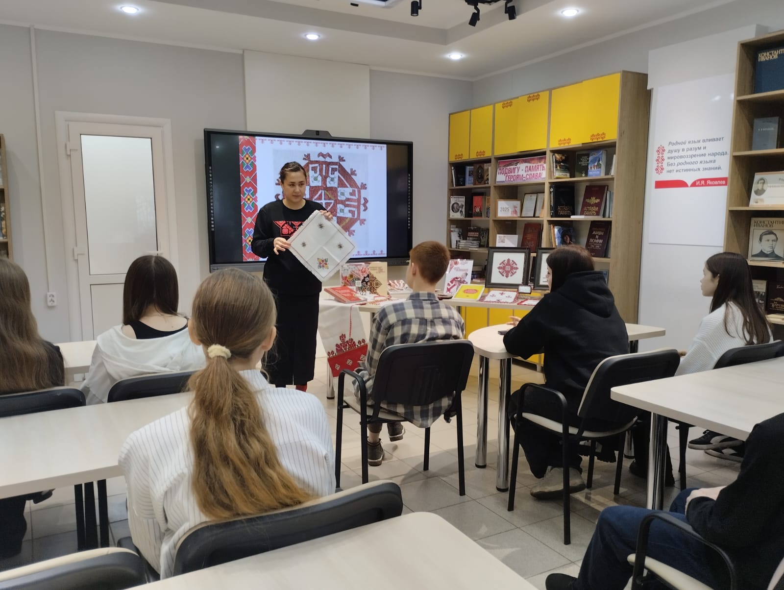 Татьяна Николаевна познакомила обучающихся 9 «б» класса Ибресинской средней общеобразовательной школы № 1 (учителя И. А. Тихонова и Н. Г. Прокопьева) с историей и техникой чувашской вышивки. Она подробно рассказала о значении орнаментов, о его связи с чувашской мифологией, символике цветов, использовании вышивки в элементах национальной одежды, а также о традиционных женских головных уборах. Особый интерес у школьников вызвал рассказ о том, как в старину девушки готовили приданое, украшая его собственноручно вышитыми узорами.