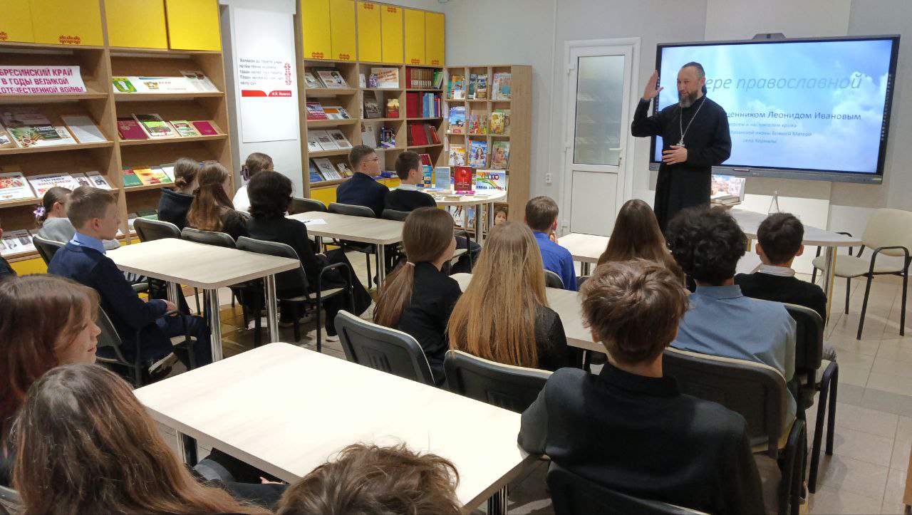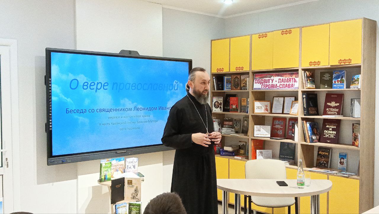 В Центральной модельной библиотеке централизованной библиотечной системы Ибресиснкого муниципального округа прошла беседа со священником «О вере православной». С подростками 8 «а» класса и классным руководителем С. В. Ерилеевой беседовал иерей Леонид Иванов, настоятель храма в честь Казанской иконы Божией Матери села Хормалы. Из разговора со священником собеседники узнали много нового об основах православной веры: например, что такое молитва и какие молитвы нужно знать православным христианам. Подробно отец Леонид рассказал о молитвах: «Отче наш», «Богородице, Дева, радуйся» и «Символ веры». В ходе беседы выяснилось, что многие из ребят знают эти молитвы. Также было сказано о православном этикете, о смыслах православных постов. Подростки больше узнали о Таинствах Церкви, например, зачем нужно верующим причащаться. Далее отец Леонид рассказал притчу из Святого Евангелия о Лазаре и богаче. Затем привел пример о чуде избавления от смерти воинов на СВО по молитвам.