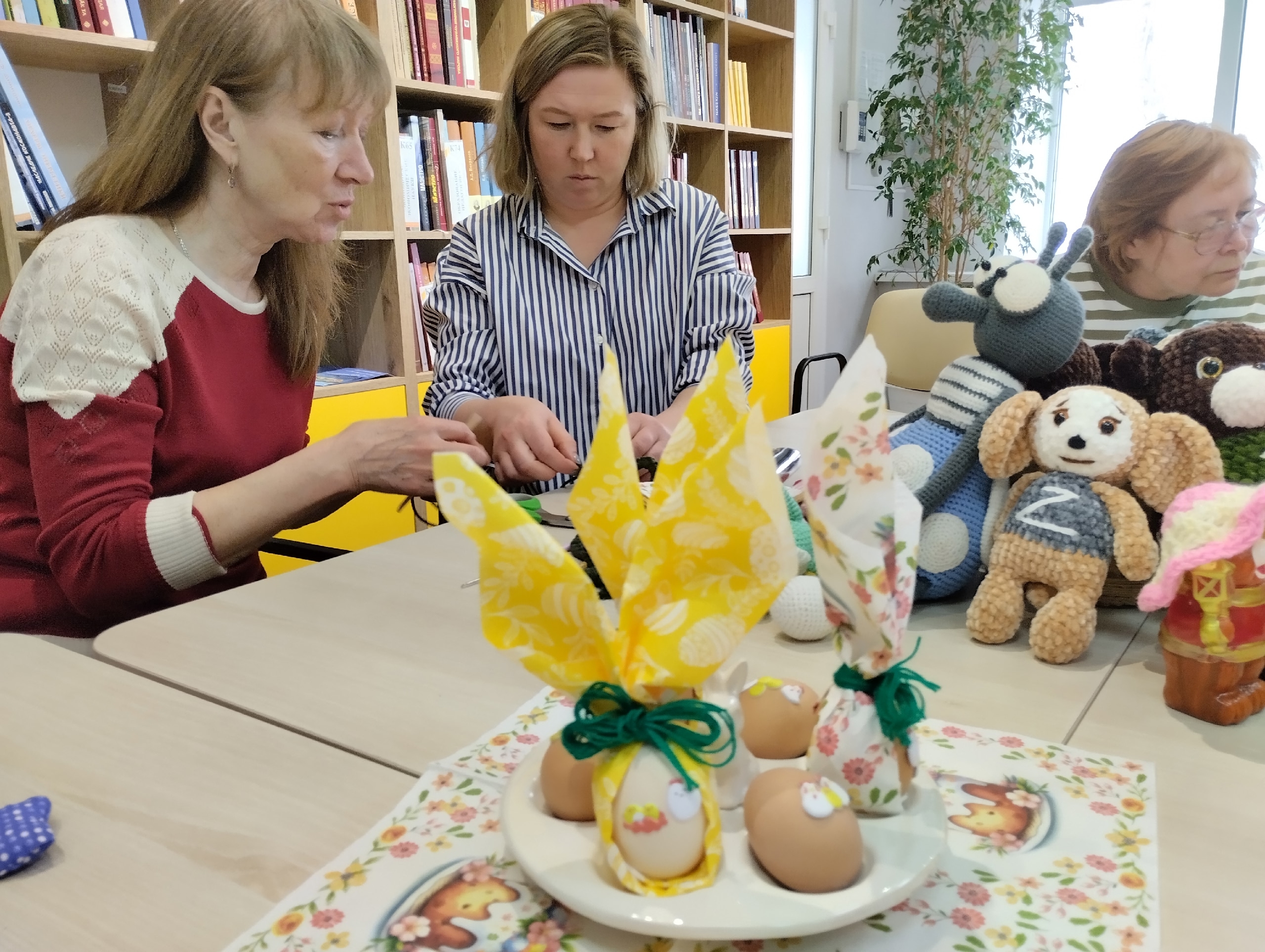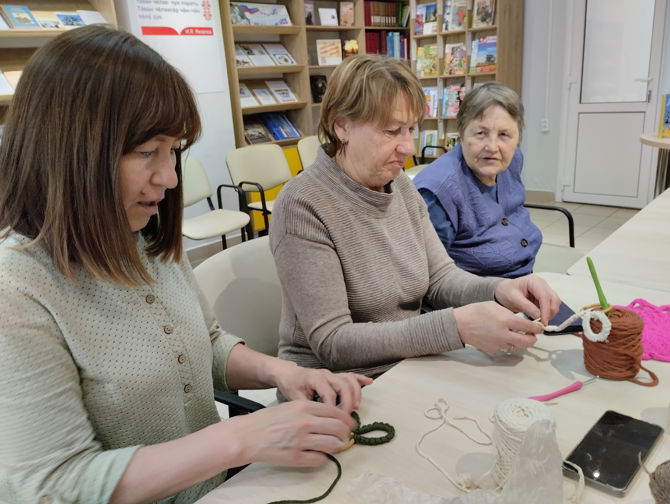 2 апреля в Центральной модельной библиотеке централизованной библиотечной системы Ибресинского муниципального округа прошло очередное вдохновляющее занятие клуба «Креатив». В преддверии светлого праздника Пасхи была выбрана тема: «Хендмейд к празднику: вяжем пасхальную корзинку в технике амигуруми». Под руководством председателя клуба Алины Константиновой и культорганизатора Ибресинского центра социального обслуживания населения (ЦСОН) Екатерины Семеновой участницы успешно научились вязать крючком простейшие, но очень милые корзинки для яиц. Кроме того, Екатерина Семенова провела мастер-класс по изящному искусству макраме — показала, как сделать стильное кольцо для сервировочной салфетки. Такое украшение станет оригинальной деталью праздничного стола. Участница клуба Татьяна Барсукова показала, как можно красиво и оригинально украсить яйца при помощи сервировочных салфеток.